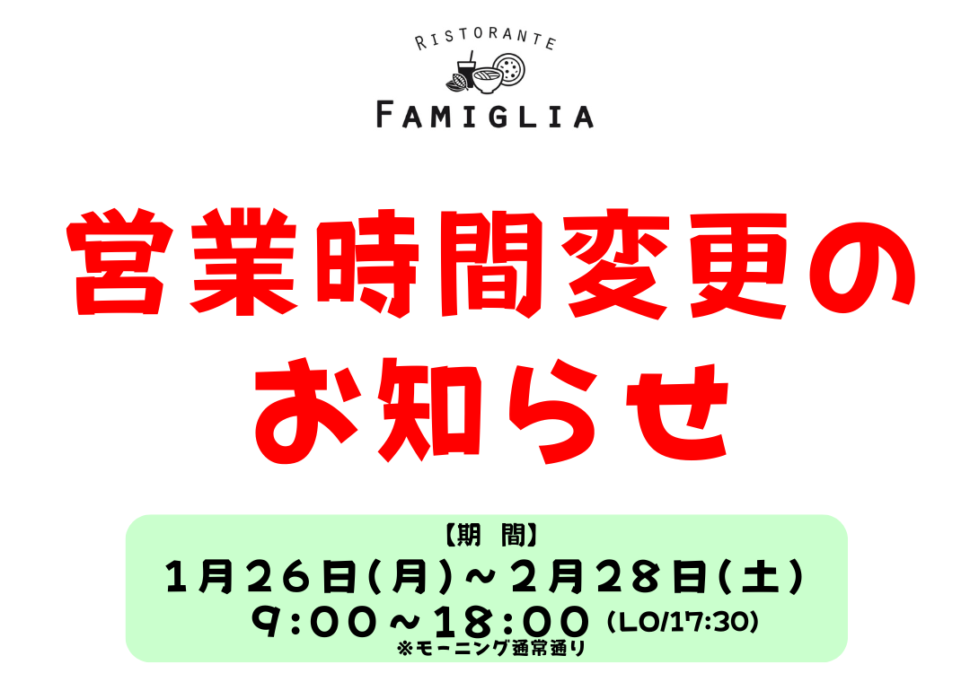 お知らせ 2026.01.16RISTORANTE FAMIGLIA 営業時間変更のお知らせ