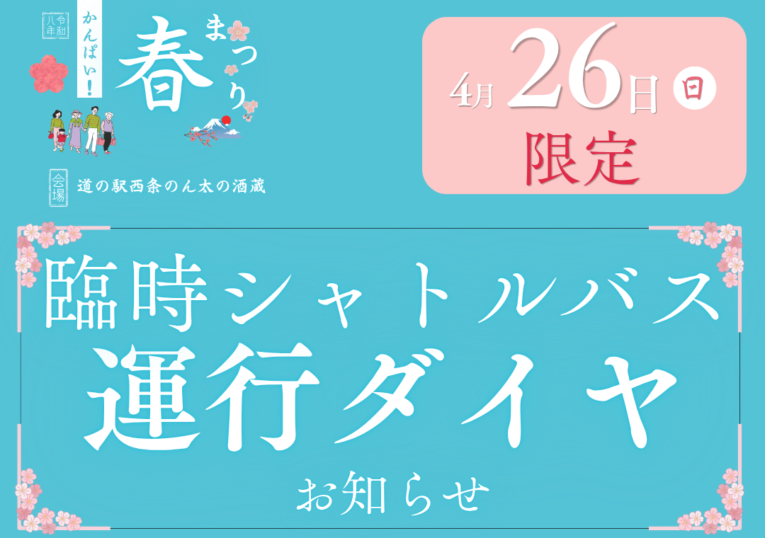 お知らせ 2026.04.08蔵開き関連イベント「かんぱい!春まつり」4月26日(日)限定 臨時シャトルバス運行のお知らせ
